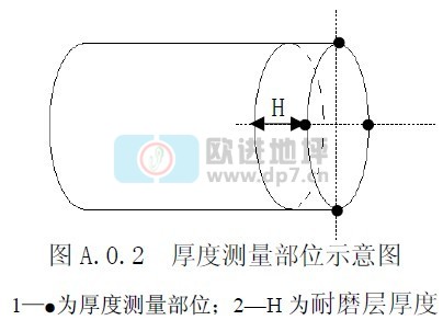 測量耐磨層厚度時,應將芯樣放置在溫度(20~25)℃、濕度(45~55)%的環境中干燥;芯樣干燥后,隨機抽取兩條互相垂直的直徑,從芯樣外側測量這兩直徑與圓周四個交點處的部位的 H(圖 A.0.2),以 4 個測量值的算術平均值表示該芯樣的耐磨層厚度,測量和計算均精確到 0.1mm。