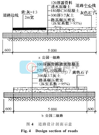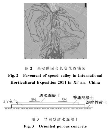 由于公園內部地基大部分為濕陷性黃土,如采用“直滲型”路面,遇雨后會造成路基沉陷,因此采用“導向滲透型”路面結構,先鋪設普通混凝土路面作為基層,基層之上再鋪設透水混凝土層,透水層由結構層和面層組成(見圖3),雨水從基層兩側的綠化帶滲入土壤。
