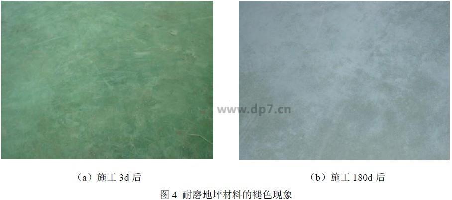 水泥基耐磨地坪的一大優勢是可以根據客戶需求,通過改變顏料種類及摻量,得到不同顏色的耐磨地坪。然而,由于很多有機類顏料耐堿耐候性較差,從而導致地坪在使用過程中發生褪色現象,如圖4 所示。