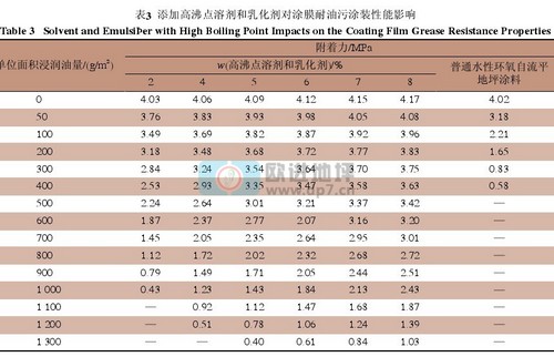 對(duì)于乳化劑和高沸點(diǎn)溶劑的添加量,在一定范圍內(nèi),添加越多對(duì)耐油污性能的提高越明顯,在實(shí)際應(yīng)用中,可根據(jù)涂料的黏度、貯存穩(wěn)定性以及底材油污含量情況來(lái)確定。
