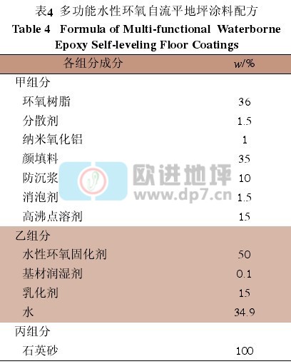 通過(guò)大量的試驗(yàn)研究,研制出了多功能水性環(huán)氧自流平地坪涂料,其配方見(jiàn)表4。