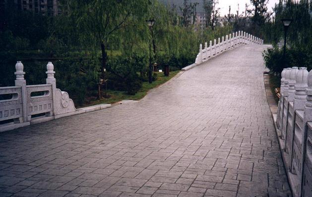17.依照參照線壓模之后,迅速取出成型模并有條不紊地按順序壓完所有混凝土的表層。如果施工時遇到有靠墻、邊角或其它不規則處,可以使用彩色藝術地坪邊角模,但使用時要注意與整體圖案的一致與協調。