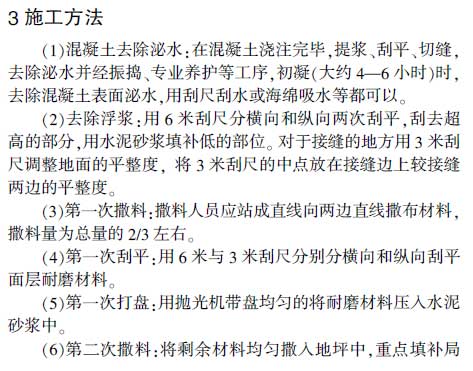 摘要:金剛砂耐磨地坪是由金剛砂、特種水泥和聚合物添加劑混合而成,該地坪與新澆筑混凝土同時施工,將其均勻撒布在初凝階段的混凝土地坪表面,經專用磨光機打磨,即可在基礎混凝土上形成一層致密、高強度的耐磨損面層,可廣泛用于需要增強表面特性的混凝土面層。