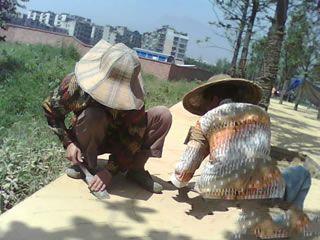 | | 藝術地坪施工2. 攤鋪標準砼.推薦配合比為:32.5水泥424KG,粗沙400KG,細沙400KG,石子(瓜子片)1100KG,水185-195KG; |