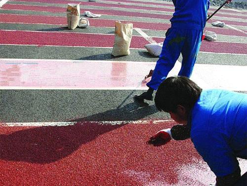 鋪撒彩色集料:不同顏色要錯開施工,以免顏色相混。