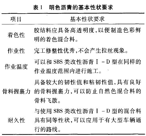 (2)彩色瀝青混凝土的結(jié)合料采用無(wú)色膠結(jié)料,主要指標(biāo)參考《公路瀝青路面施工技術(shù)規(guī)范》(JTG F40—2004)中對(duì)聚合物改性瀝青SBS(I—D)的技術(shù)要求,并且明色瀝青的基本性狀應(yīng)滿足表1要求。