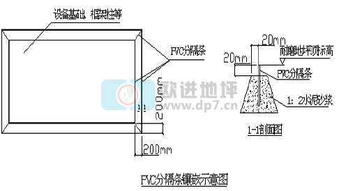 (4) 標高測設及鑲嵌分隔條。用水準儀將+50cm標高所有框架柱及墻面上,并據此貼出灰餅,灰餅間距不大于3m,灰餅材料建議選用細石混凝土。根據測設的標高在所有設備基礎、混凝土柱、溝道、坑池、洞口、管道與耐磨地坪交接處鑲嵌PVC分隔條。分隔條鑲嵌必須牢固、平直、順滑,上標高準確。鑲嵌完成后必須用施工線或者水準儀符合校驗,本道工序是控制好耐磨地坪平整度的前提,標高必須由專業技術人員進行測量。分隔條鑲嵌如下圖所示: